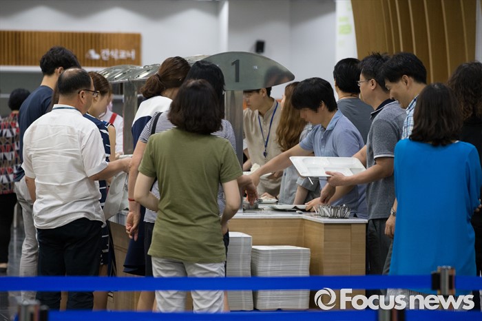 (서울=포커스뉴스) 수도권 대부분 지역에 엿새째 폭염경보가 내려진 9일 오전 서울 중구 한 구내식당이 직원들로 붐비고 있다.