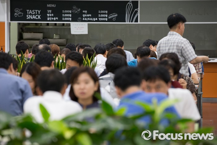 (서울=포커스뉴스) 수도권 대부분 지역에 엿새째 폭염경보가 내려진 9일 오전 서울 중구 한 구내식당이 직원들로 붐비고 있다.