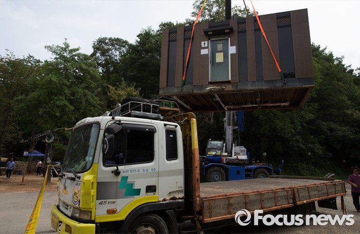 (남양주=포커스뉴스) 9일 오전 경기 남양주 봉주르 카페에서 남양주시 관계자들이 중장비를 동원해 건축법 제11조 등 3건의 위반 건축물에 대한 행정대집행 중 위반 건축물을 대형 트럭에 옮기고 있다.