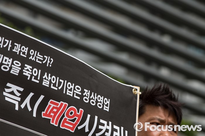 (서울=포커스뉴스) 9일 오후 서울 영등포구 옥시 한국 본사 앞에서 가습기 살균제 피해자와 유가족들이 옥시 최종배상안 철회와 상세한 수사를 촉구하며 기자회견을 하고 있다.