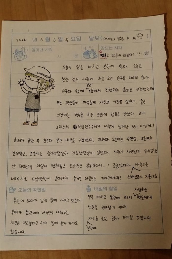 (서울=포커스뉴스) 9일 오전 서울 마포구 이화여대에서 최경희 총장 사퇴를 요구하며 농성을 벌이고 있는 본관 내부 모습이 공개됐다. 한 학생의 농성 기간 일기장이 보이고 있다.<사진제공=이화여대언론팀>