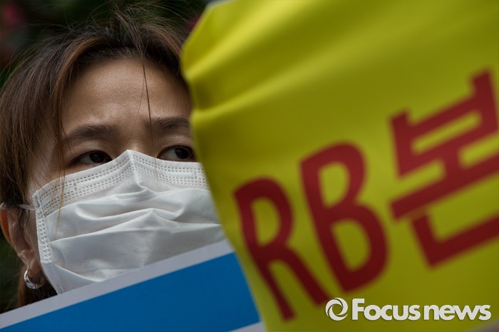 (서울=포커스뉴스) 9일 오후 서울 영등포구 옥시 한국 본사 앞에서 가습기 살균제 피해자와 유가족들이 옥시 최종배상안 철회와 상세한 수사를 촉구하며 기자회견을 하고 있다.