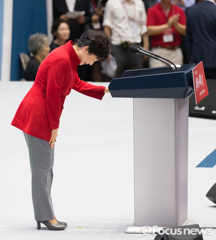 (서울=포커스뉴스) 박근혜 대통령이 9일 오후 서울 송파구 잠실실내체육관에서 열린 제4차 새누리당 전당대회에서 축사를 위해 단상에 올라 인사를 하고 있다.