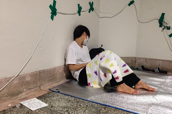 (서울=포커스뉴스) 9일 오전 서울 마포구 이화여대에서 최경희 총장 사퇴를 요구하며 농성을 벌이고 있는 본관 내부 모습이 공개됐다. 한 학생이 벽에 기대어 잠을 청하고 있다. <사진제공=이화여대언론팀>