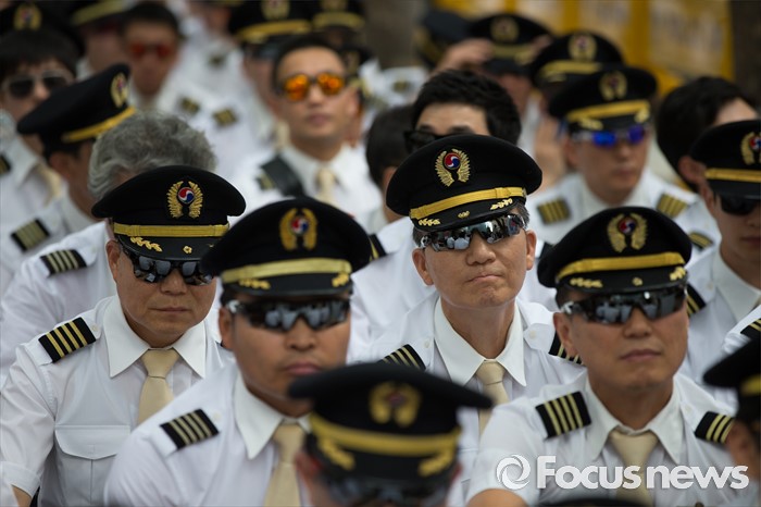 (서울=포커스뉴스) 9일 오후 서울 종로구 서울지방국세청 앞에서 열린 대한항공 경영정상화를 위한 세무조사 촉구대회에서 대한항공 조종사 노동조합 조합원들이 경과 보고를 듣고 있다.