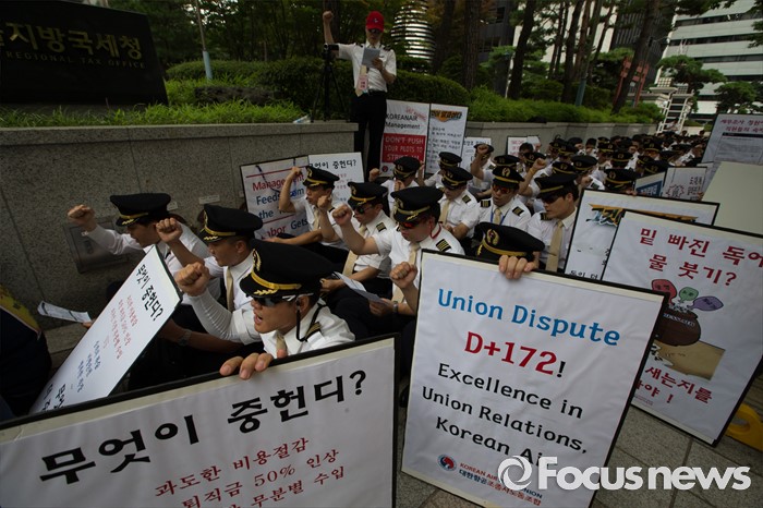 (서울=포커스뉴스) 9일 오후 서울 종로구 서울지방국세청 앞에서 열린 대한항공 경영정상화를 위한 세무조사 촉구대회에서 대한항공 조종사 노동조합 조합원들이 구호를 외치고 있다.