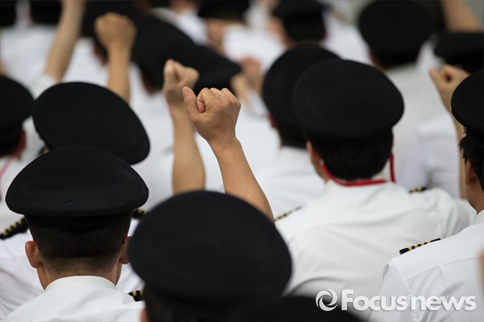 (서울=포커스뉴스) 9일 오후 서울 종로구 서울지방국세청 앞에서 열린 대한항공 경영정상화를 위한 세무조사 촉구대회에서 대한항공 조종사 노동조합 조합원들이 구호를 외치고 있다.