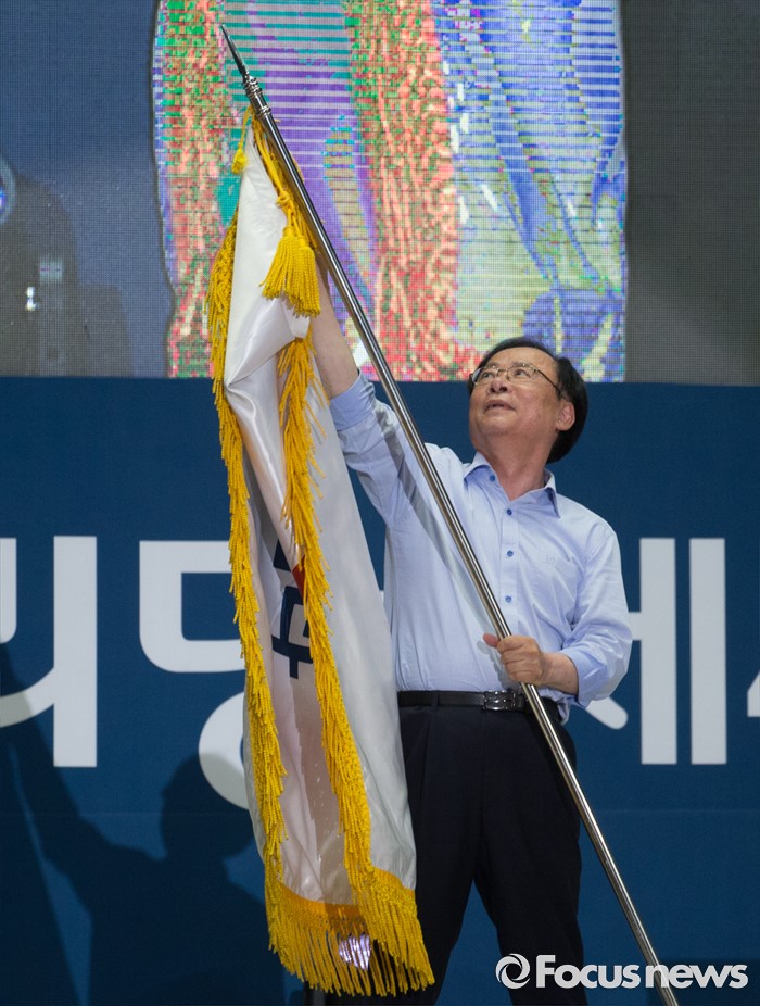 (서울=포커스뉴스) 9일 오후 서울 송파구 잠실실내체육관에서 열린 새누리당 4차 전당대회에 참석한 이주영 당대표 후보가 정견발표 중 당기를 흔들다 깃발이 꼬여 풀고 있다.