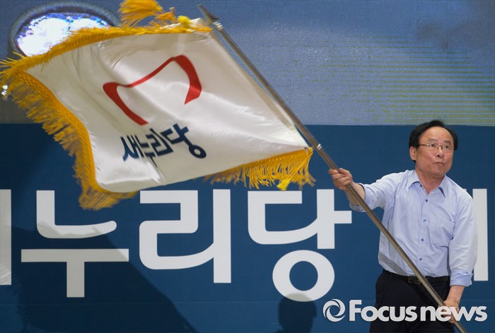 (서울=포커스뉴스) 9일 오후 서울 송파구 잠실실내체육관에서 열린 새누리당 4차 전당대회에 참석한 이주영 당대표 후보가 정견발표 중 당기를 흔들고 있다.