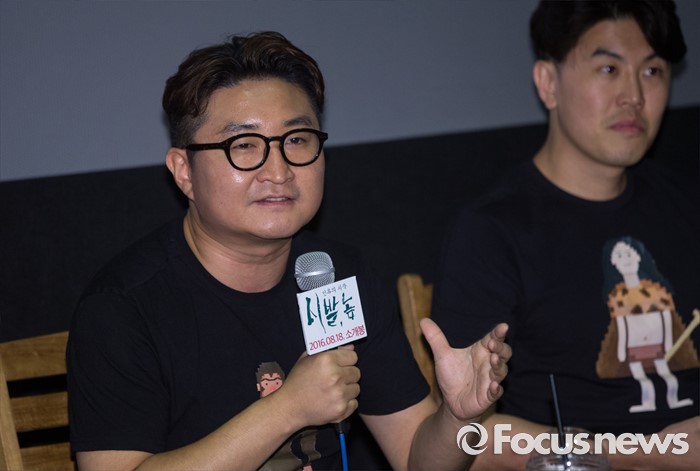(서울=포커스뉴스) 9일 오후 서울 동작구 아트나인에서 열린 영화 '시발, 놈 : 인류의 시작' 언론시사회에 참석한 백승기 감독이 취재진의 질문에 답하고 있다.