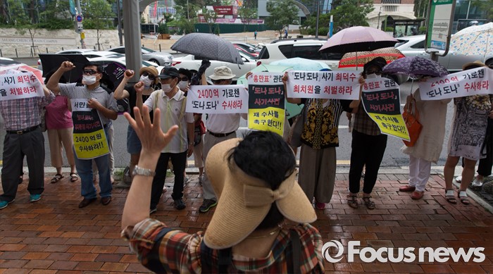 (서울=포커스뉴스) 9일 오후 서울 서초구 서초역 앞에서 도나도나 피해자 모임 관계자들이 '도나도나 돼지분양 사기사건' 재수사를 촉구하는 구호를 외치고 있다.