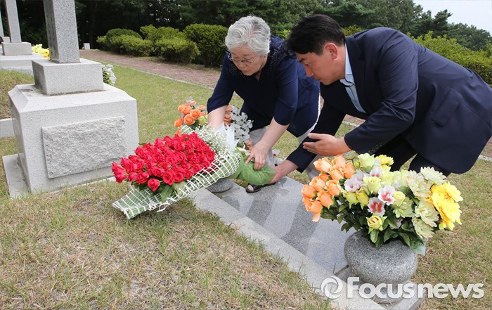(대전=포커스뉴스) 9일 오후 대전 유성구 국립대전현충원 국가사회공헌자묘역에서 베를린 올림픽 마라톤 금메달리스트 손기정 선수의 딸 손문영 여사와 외손주인 이준승 손기정기념재단 사무총장이 손기정 선수 묘소에 80송이의 장미꽃을 헌화하고 있다. 손기정 선수는 80년 전인 1936년 8월 9일 베를린 올림픽 마라톤에서 금메달을 목에 걸었다.