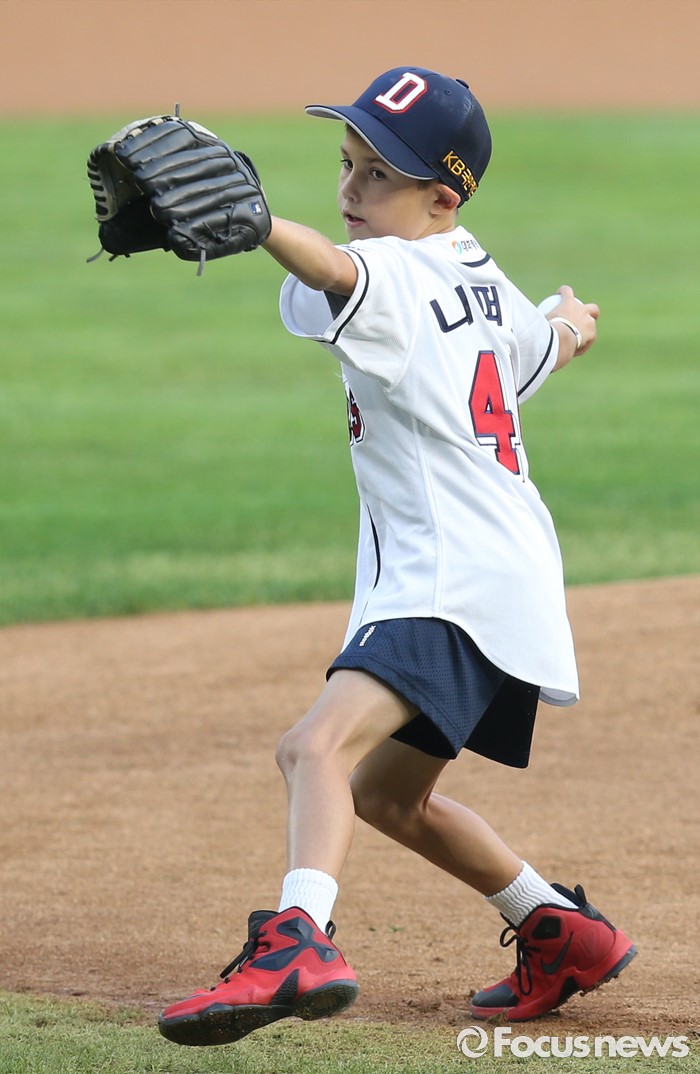 (서울=포커스뉴스) 9일 서울 잠실구장에서 열린 2016 프로야구 KIA-두산 경기에 앞서 두산 투수 니퍼트의 아들 케이든이 시구하고 있다.