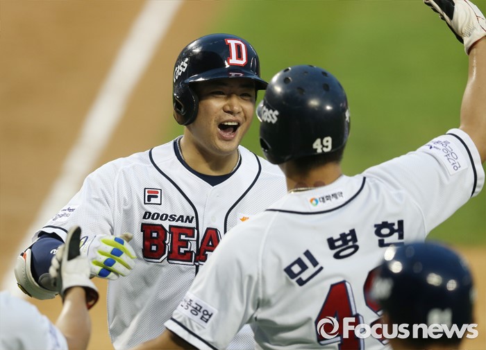 (서울=포커스뉴스) 9일 서울 잠실구장에서 열린 2016 프로야구 KIA-두산 경기 2회말 1사 1,3루에서 두산 김재환이 우월 3점 홈런을 날리고 홈인하며 선행주자 민병헌의 환영을 받고 있다.