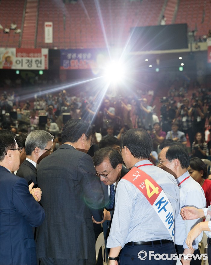 (서울=포커스뉴스) 9일 오후 서울 송파구 잠실실내체육관에서 열린 제4차 새누리당 전당대회에서 당대표로 선출된 이정현이 김희옥 혁신비대위원장과 정진석 원내대표의 축하를 받고 있다.