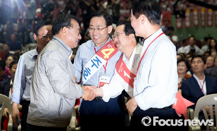 (서울=포커스뉴스) 9일 오후 서울 송파구 잠실실내체육관에서 열린 제4차 새누리당 전당대회에서 당대표로 선출된 이정현(왼쪽)이 한선교(오른쪽부터), 주호영, 이주영 후보들과 인사를 하고 있다.