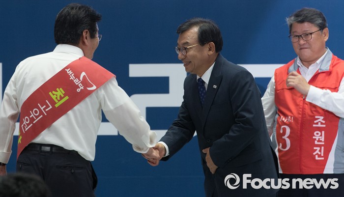 (서울=포커스뉴스) 9일 오후 서울 송파구 잠실실내체육관에서 열린 새누리당 4차 전당대회에서 당대표로 선출된 이정현(가운데) 의원이 최고위원으로 선출된 강석호(왼쪽), 조원진 의원과 악수하고 있다.
