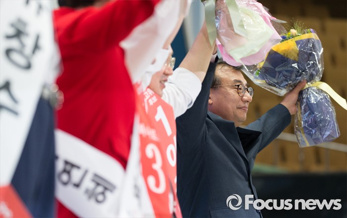 (서울=포커스뉴스) 9일 오후 서울 송파구 잠실실내체육관에서 열린 제4차 새누리당 전당대회에서 당대표로 선출된 이정현 의원이 만세를 하고 있다.