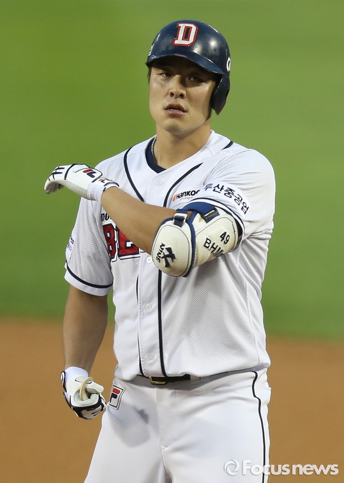(서울=포커스뉴스) 9일 서울 잠실구장에서 열린 2016 프로야구 KIA-두산 경기 2회말 1사 만루에서 두산 민병헌이 2타점 적시타를 치고 1루에서 박수치며 기뻐하고 있다.