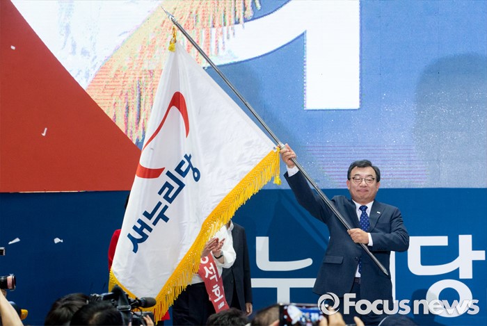 (서울=포커스뉴스) 9일 오후 서울 송파구 잠실실내체육관에서 열린 새누리당 4차 전당대회에서 신임 당대표로 선출된 이정현 의원이 당기를 흔들고 있다.