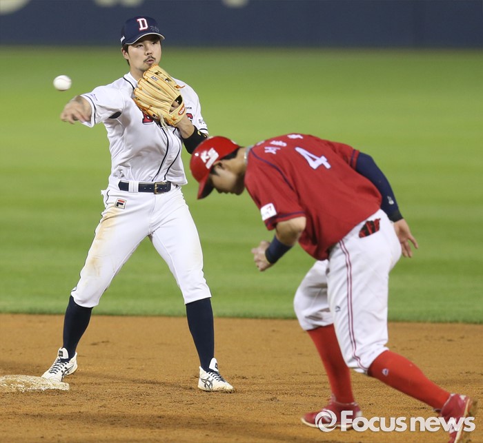 (서울=포커스뉴스) 9일 서울 잠실구장에서 열린 2016 프로야구 KIA-두산 경기 9회초 두산 2루수 오재원이 KIA 이성우의 유격수앞 땅볼떄 1루주자 서동욱을 2루에서 포스아웃시킨후 1루로 송구하고 있다. 병살플레이 성공.