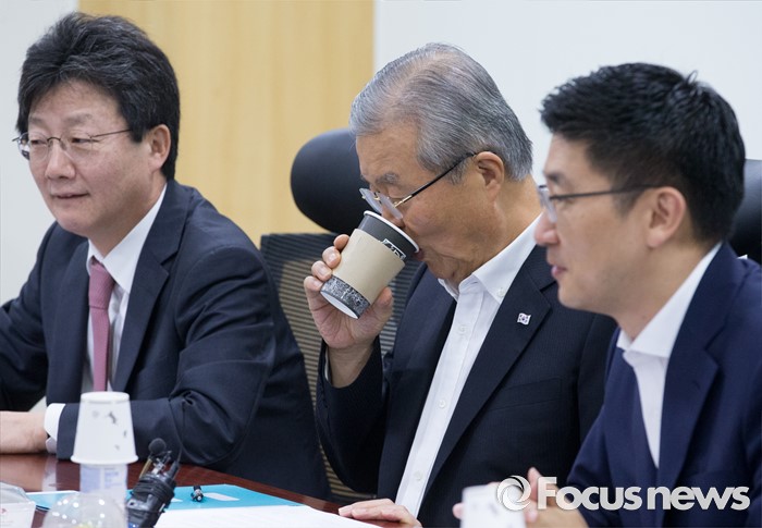(서울=포커스뉴스) 10일 오전 서울 여의도 국회 의원회관에서 열린 '어젠다(Agenda) 2050' 회의에 참석한 김종인(가운데) 더불어민주당 비대위 대표가 커피를 마시고 있다.