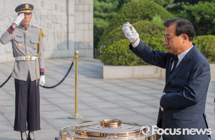 (서울=포커스뉴스) 8·9 전당대회에서 새누리당 대표로 선출된 이정현 대표가 10일 오전 서울 동작구 국립현충원에서 분향하고 있다.