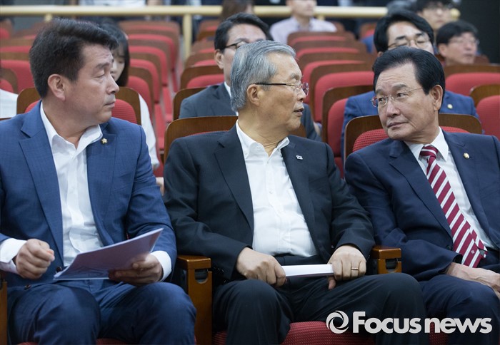 (서울=포커스뉴스) 10일 오전 서울 여의도 국회 의원회관에서 열린 더불어민주당 청년지원사업(청년수당)으로 본 청년 구직지원 및 구직안전망 긴급토론회에 참석한 김종인(가운데) 비대위 대표와 변재일(오른쪽) 정책위의장이 대화하고 있다. 왼쪽은 토론회를 주관한 기동민 의원.