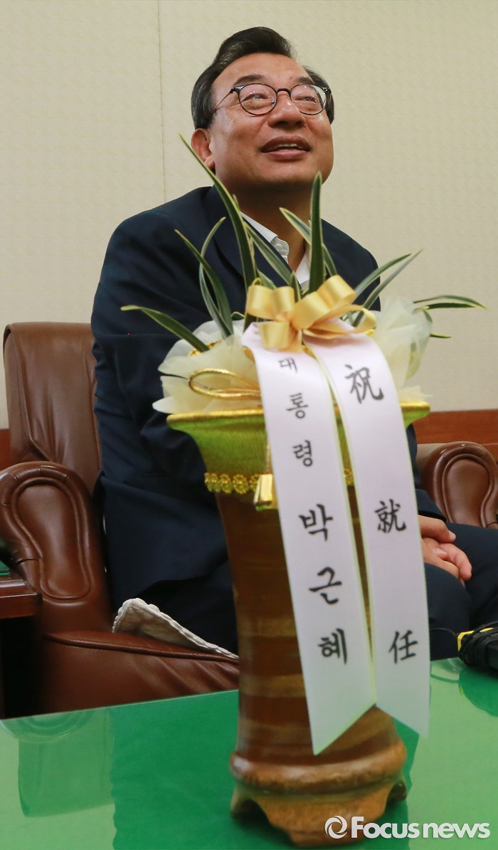 (서울=포커스뉴스) 이정현 새누리당 대표가 10일 오전 서울 여의도 새누리당 당사에서 김재원 청와대 정무수석에게 박근혜 대통령 축하 난을 전달 받은 뒤 탁자 위에 올려 놓고 있다.