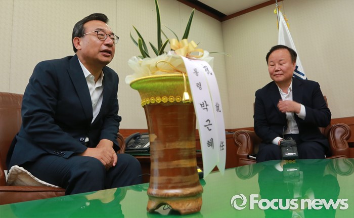 (서울=포커스뉴스) 김재원(오른쪽) 청와대 정무수석이 10일 오전 서울 여의도 새누리당 당사를 찾아 이정현 신임 대표에게 박근혜 대통령 명의의 축하 난을 전달한 뒤 대화 하고 있다.