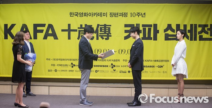 (서울=포커스뉴스) 10일 오전 서울 중구 프레스센터에서 열린 '한국영화아카데미 장편과정 10주년 카파 십세전' 홍보대사 위촉식에 서 배우 이제훈(오른쪽 두번째)이 홍보대사로 위촉되고 있다.