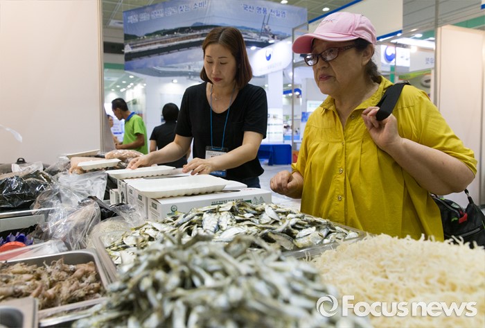 (서울=포커스뉴스) 10일 오후 서울 강남구 코엑스에서 열린 '2016 한가위 명절선물상품전'을 찾은 한 시민이 건어물선물세트 판매 부스를 둘러보고 있다.