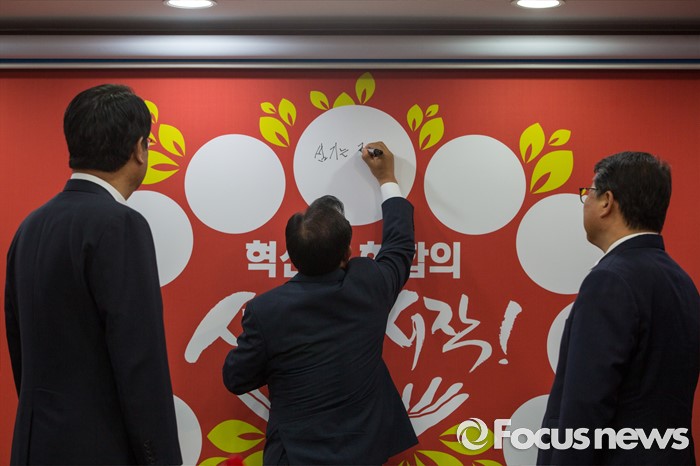 (서울=포커스뉴스) 이정현(가운데) 새누리당 대표가 10일 오전 서울 여의도 새누리당사에서 열린 최고위원회의에 참석해 혁신과 화합의 나무에 서명을 하고 있다.