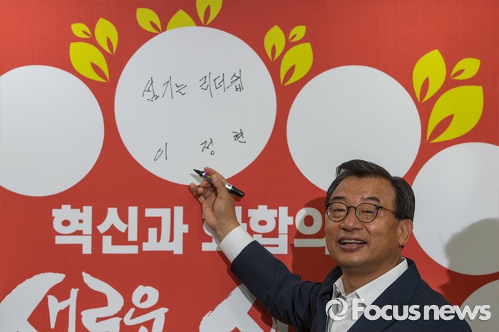 (서울=포커스뉴스) 이정현 새누리당 대표가 10일 오전 서울 여의도 새누리당사에서 열린 최고위원회의에 참석해 혁신과 화합의 나무에 서명을 마친 뒤 취재진을 향해 포즈를 취하고 있다.