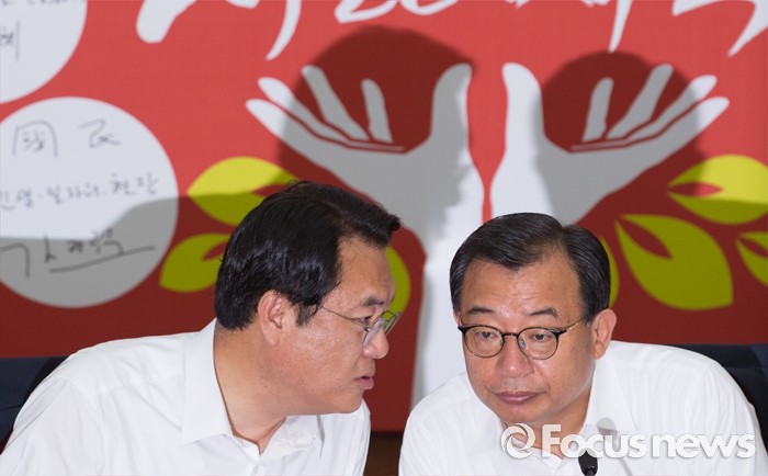 (서울=포커스뉴스) 이정현(오른쪽) 새누리당 대표와 정진석 원내대표가 10일 오전 서울 여의도 새누리당사에서 열린 최고위원회의에 참석해 대화 하고 있다.