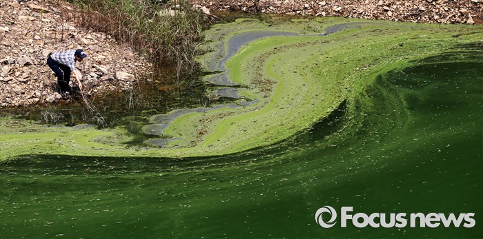 (청주=포커스뉴스) 10일 충북 청주시 문의면 일대 대청호에서 녹조와 녹조부유물이 보이고 있다. 지난 3일 대청호 전 수역에 조류 경보 '관심단계'가 발령됐다. 문의지역의 유해 남조류 세포수가 1ml당 7470을 기록했다.