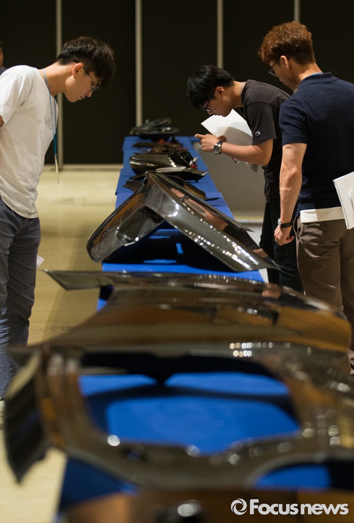 (서울=포커스뉴스) 10일 오후 서울 강남구 코엑스에서 열린 '2016 오토모티브 테크놀로지 엑스포'을 찾은 관람객들이 카본으로 제작된 자동차 부품들을 바라보고 있다.