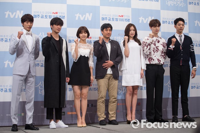 (서울=포커스뉴스) 10일 오후 서울 강남구 임피리얼 팰리스호텔에서 열린 tvN 금토드라마 '신데렐라와 네 명의 기사' 제작발표회에 참석한 배우 최민(왼쪽부터), 정일우, 박소담, 권혁찬 감독, 손나은, 안재현, 이정신이 포토타임을 갖고 있다.