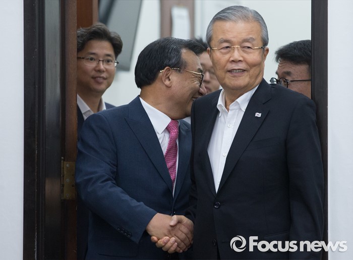 (서울=포커스뉴스) 10일 오후 서울 여의도 국회에서 이정현(왼쪽) 새누리당 신임 대표가 김종인 더불어민주당 비대위 대표와 만나 면담에 앞서 인사하고 있다.