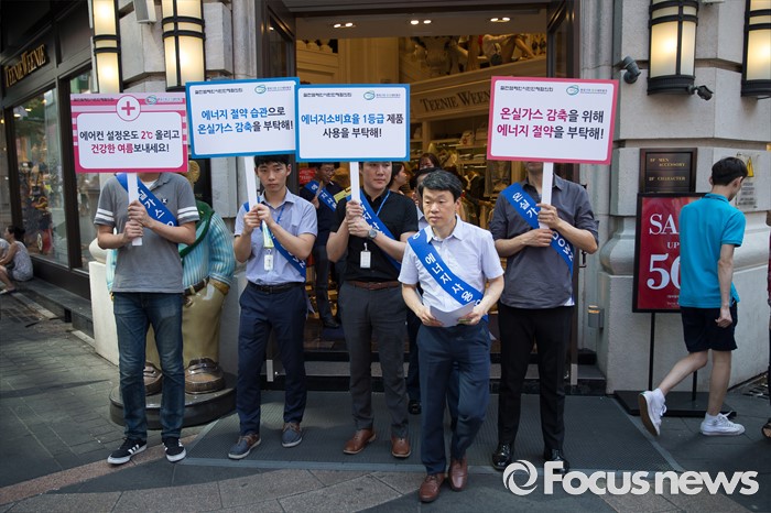 (서울=포커스뉴스) 서울시, 산업부 관계자들이 10일 오후 서울 중구 명동의 한 가게에서 에너지 절약 캠페인을 벌이고 있다. 지난 9일 폭염으로 인한 전력 수요 급증에 정부는 오는 11일부터 개문냉방 업소 단속에 나선다고 밝혔다.