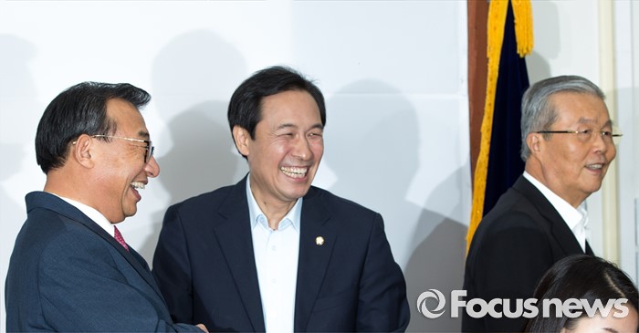(서울=포커스뉴스) 우상호(가운데) 더불어민주당 원내대표가 10일 오후 서울 여의도 국회에서 김종인(오른쪽) 더불어민주당 비상대책위 대표를 예방한 이정현 새누리당 대표와 대화 하고 있다.