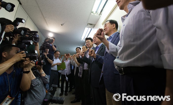(서울=포커스뉴스) 10일 오후 서울 종로구 대한변호사회관에서 이재오(오른쪽), 최병국 전 의원이 중도신당 창당추진위원회 사무실 입주 및 현판식을 마치고 파이팅을 외치고 있다.
