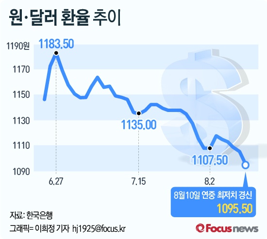 (서울=포커스뉴스) 10일 서울 외환시장의 원·달러 환율은 전날보다 10.7원 내린 1095.4원에 마감했다. 원·달러 환율은 2015년 6월 22일(1098.8원) 이후 최저치로 약 14개월만에 1,100원선 밑으로 하락했다.