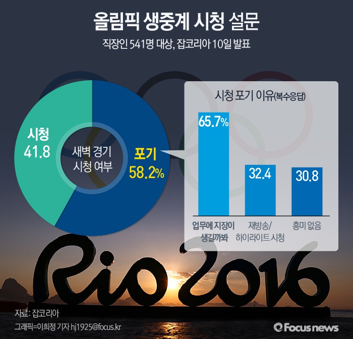 (서울=포커스뉴스) 10일 취업포털 잡코리아가 발표한 자료에 따르면 '새벽‧이른 아침에 진행되는 올림픽 경기를 시청할 것인가'라는 질문에 직장인 541명 중 58.2%가 '포기한다'고 답했다. 포기한 이유에 대해서는 '업무에 지장이 생길것 같아서'라는 답변이 가장 많았다.