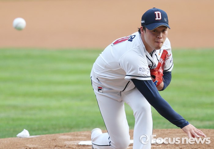 (서울=포커스뉴스) 10일 서울 잠실구장에서 열린 2016 프로야구 KIA-두산 경기에서 1회초 두산 선발투수 안규영이 투구하고 있다.