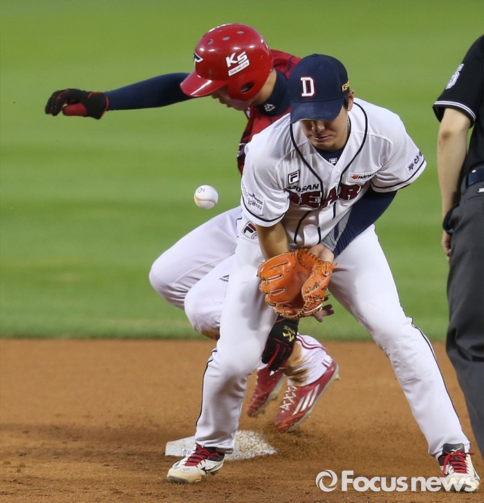 (서울=포커스뉴스) 10일 서울 잠실구장에서 열린 2016 프로야구 KIA-두산 경기 3회초 2사 1,3루에서 KIA 1루주자 김호령이 2루 도루에 성공하고 있다.