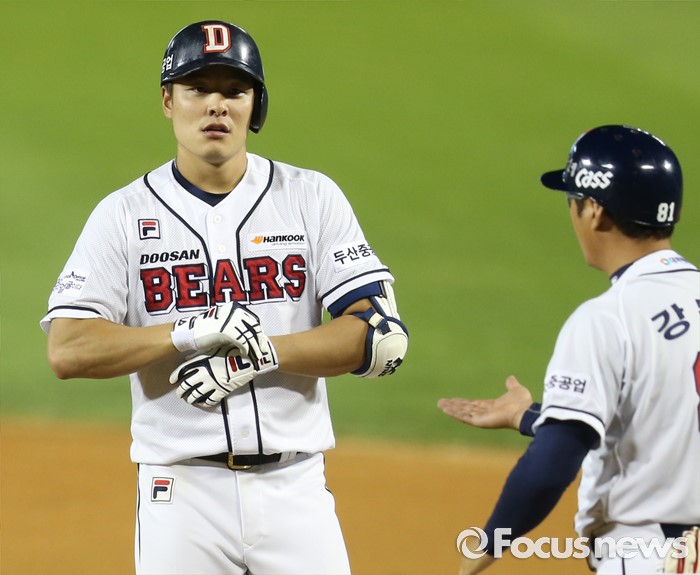 (서울=포커스뉴스) 10일 서울 잠실구장에서 열린 2016 프로야구 KIA-두산 경기 5회말 2사 1,3루에서 두산 민병헌이 1타점 우전 안타를 치고 1루에서 강동우 코치의 축하를 받고 있다.