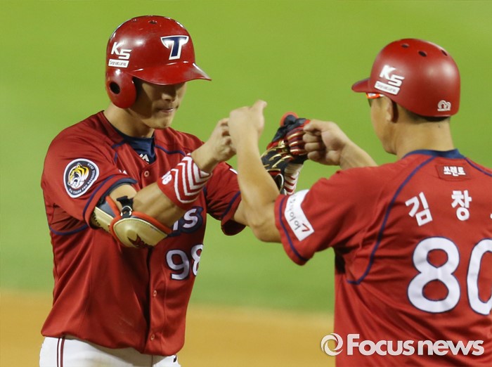 (서울=포커스뉴스) 10일 서울 잠실구장에서 열린 2016 프로야구 KIA-두산 경기 7회초 2사 2,3루에서 KIA 노수광이 2타점 우전 안타를 치고 1루에서 김창희 코치와 주먹을 마주치고 있다.
