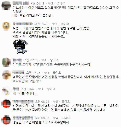 여기에 외국인들까지 가세해 기보배 비난에 열을 올렸다. 기보배의 해당 인터뷰가 나간 뒤 기보배의 공식 페이스북 계정에는 외국인들의 비난글이 폭주했다. 이들은 "세계가 당신을 혐오스럽게 바라보고 있다. 개를 먹지 마라(THE WORLD IS WATCHING YOY WITH DISGUST. DONT EAT DOGS)", "짐승(BEAST)", "한국은 최고로 잔인한 팀이다. 개를 먹기위해 학살하는 자들(KOREA THE BEST TEAM OF CRUELTY. DOG KILLERS FOR EAT)" 등 글로 비난의 목소리를 높였다. 10일 오전 현재 기보배의 공식 페이스북 계정에는 해당 비난글들이 상당수 삭제된 상태다.