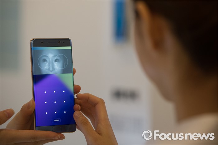 (서울=포커스뉴스) 11일 오전 서울 서초구 삼성전자 사옥에서 열린 '갤럭시 노트7 출시 미디어 행사'에서 관계자들이 제품의 홍채 인식 기능을 선보이고 있다.
